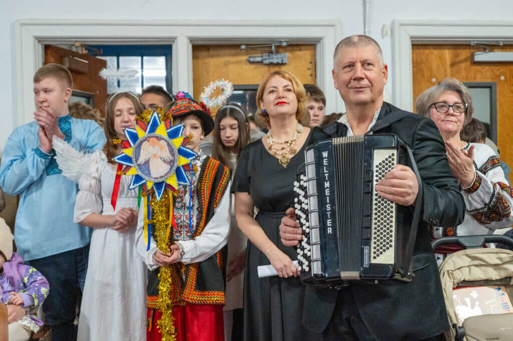 Завершивши концертну програму колядкою “Різдво іде по Україні” у виконанні учнів 1-В та 2-В, під проводом вчителів музики ще колядував і весь зал про три празники, які ідуть до нас в гості, і які несуть нам сподівання від новонародженого Ісуса про справедливий мир у дорогій нашій Україні.